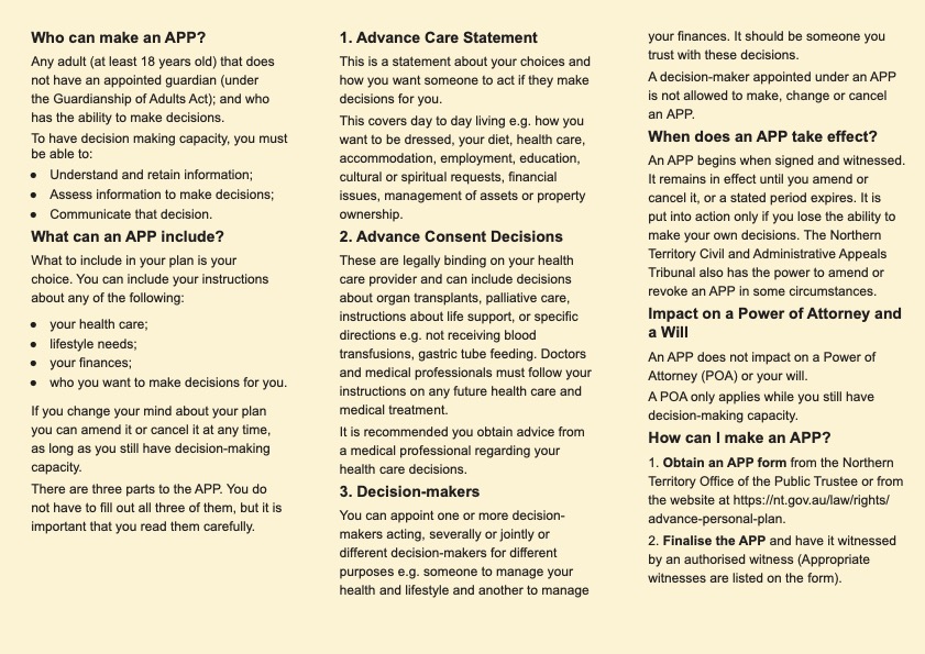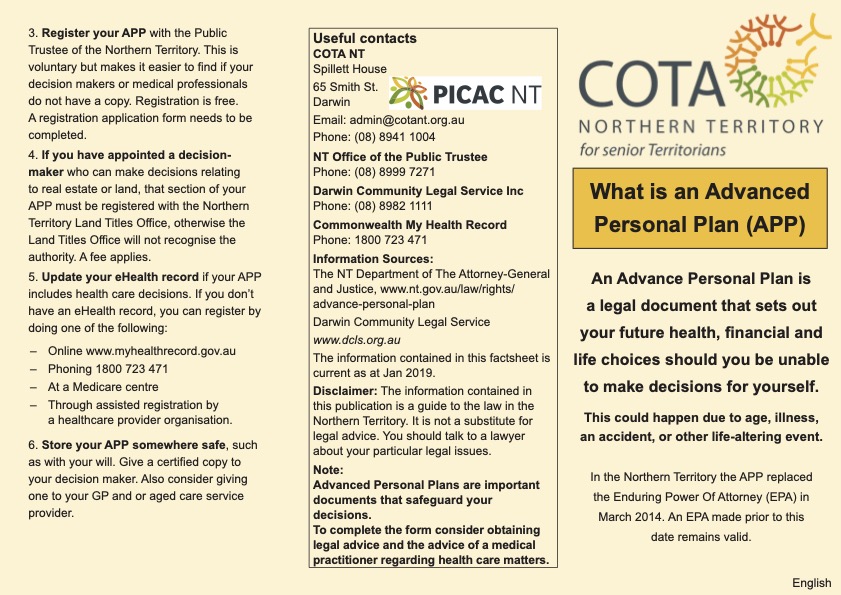 To learn more about the APP, how to make one, who to appoint as a decision maker, and more, please visit the COTA NT website or the Northern Territory Government website.