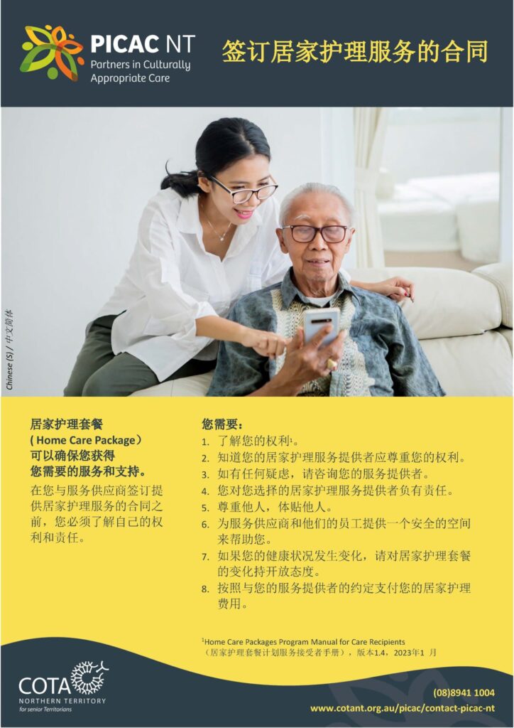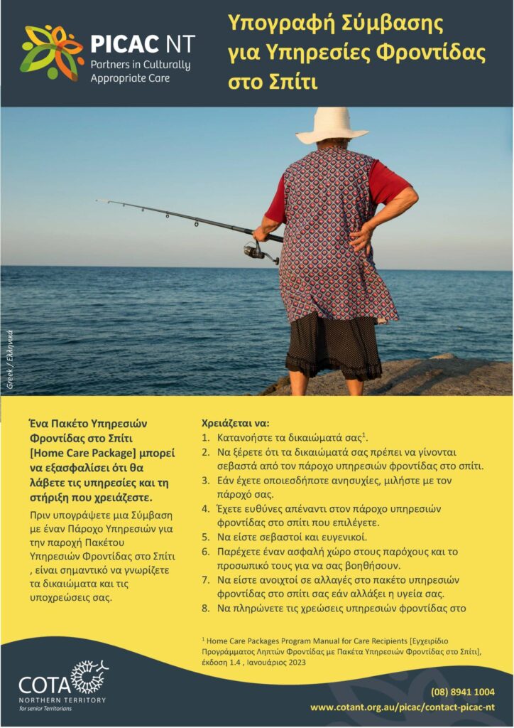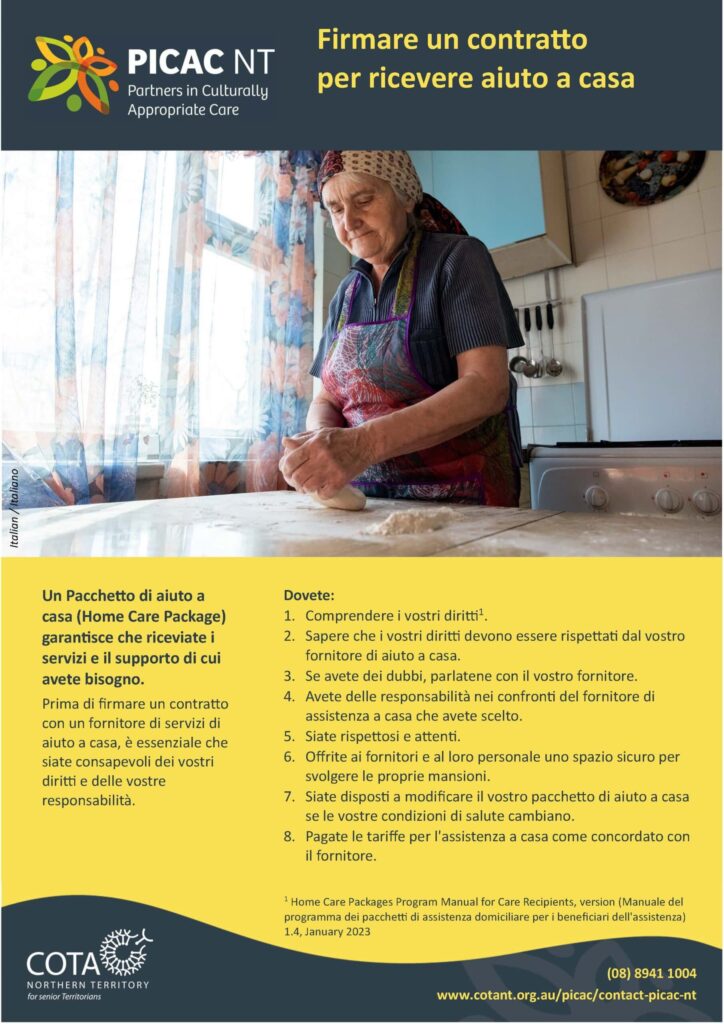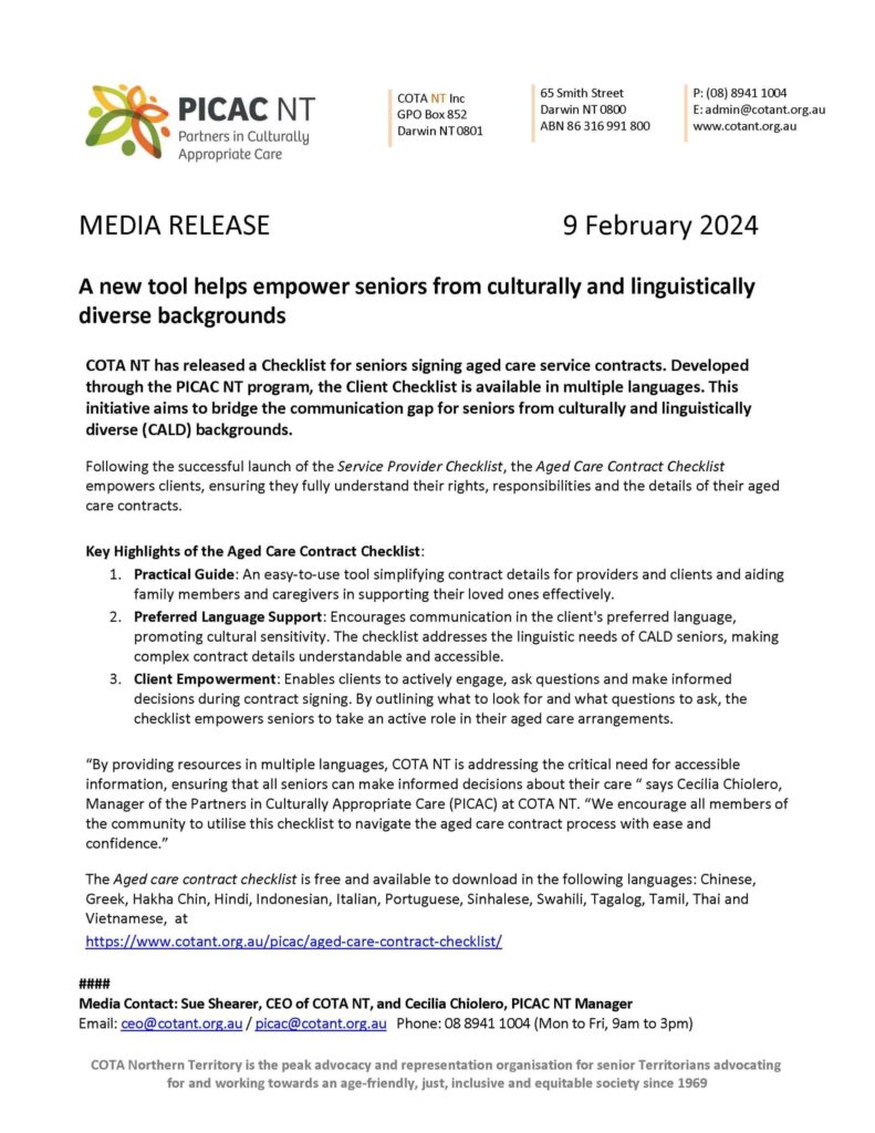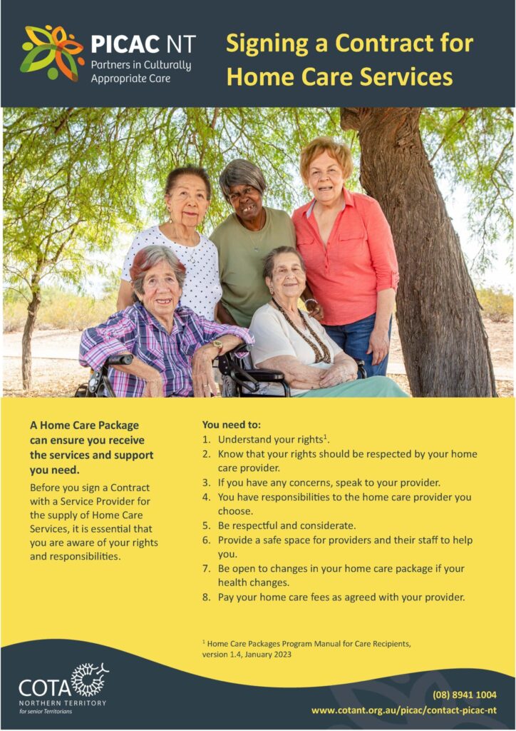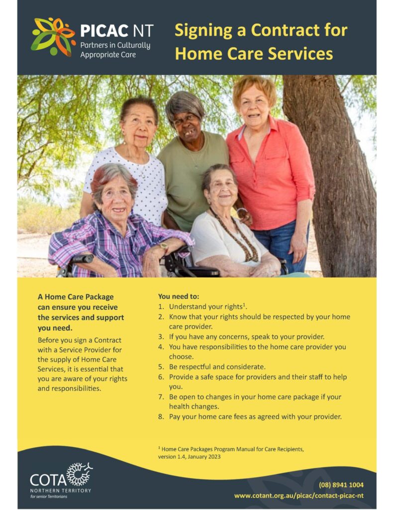 - Any of the resources produced by PICAC NT can be freely provided on request. *Aged care contract checklists can be translated free of charge, as can any contracts, flyers and administrative document used by service providers. Contact the PICAC Manager for help with translations.