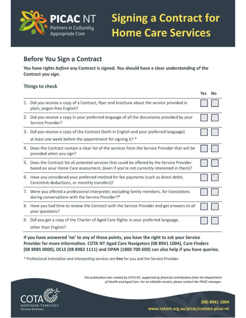 - PICAC_ContractChecklist_Client_EN Before signing a contract for home care, you should be able to tick yes to 10 checklist items.